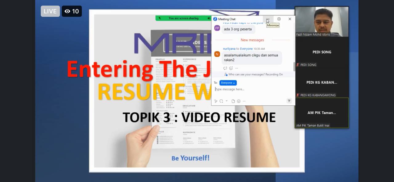 Program : Entering The Job Market – Resume Writing (Topic 3)Tarikh : 8 Ogos 2023Masa : 10.30 – 12.00 tghTempat : PEDi KDAST2Peserta : Umum