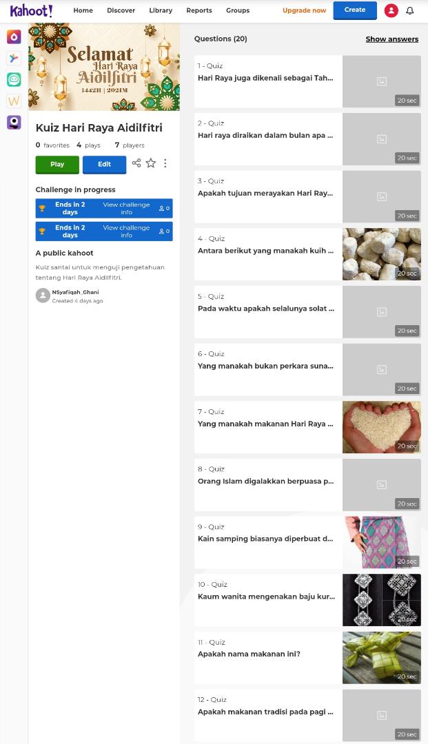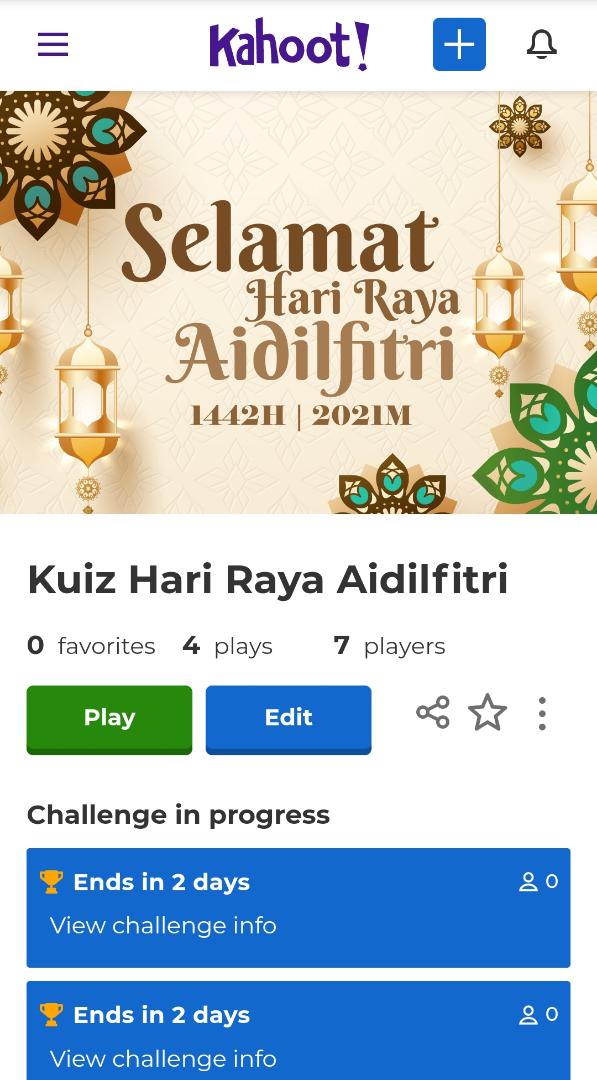 Program : Kahhot (Kuiz Atas Talian) – Raya Aidilfitri 2021Tarikh : 21 Mei 2021Masa : 10.00 – 12.00 tghTempat : –Peserta : Komuniti